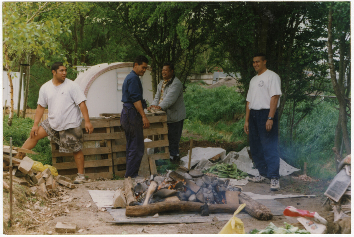 University of Canterbury Samoan Students Association members preparing the umu at the Iosefa home at Regent's Park.