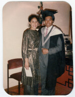 Sarona Ai'ono and Leua Tea Iosefa posing, with Leua in a cap and gown, at his graduation dinner at the Pagoda Restaurant in Colombo Street.