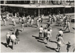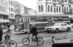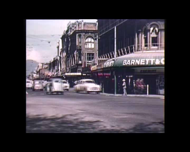 View down Colombo Street from South Cathedral Square looking towards the intersection with Hereford Street. Pedestrians, buses, cars and cyclists are all travelling along the roads and passing each other at the intersection. Clip taken from "Personal Record. Oxley, Jack. Beauty Where it is Found" film.