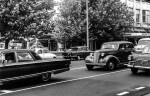 View of cars travelling along Colombo Street towards Cathedral Square past the fountains at the top of High Street.