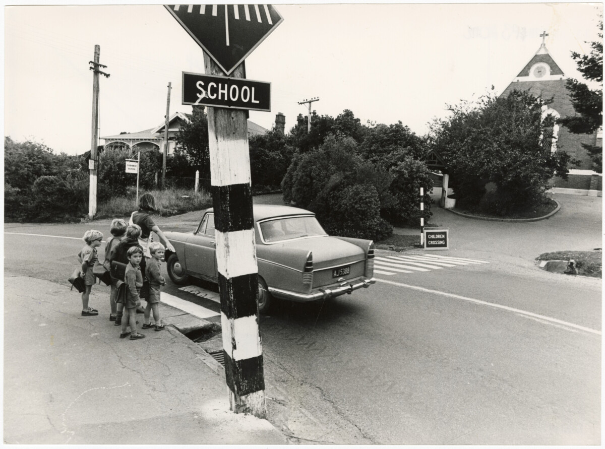 View of a women with a group of children waiting at the Dyers Pass Road pedestrian crossing in Cashmere.