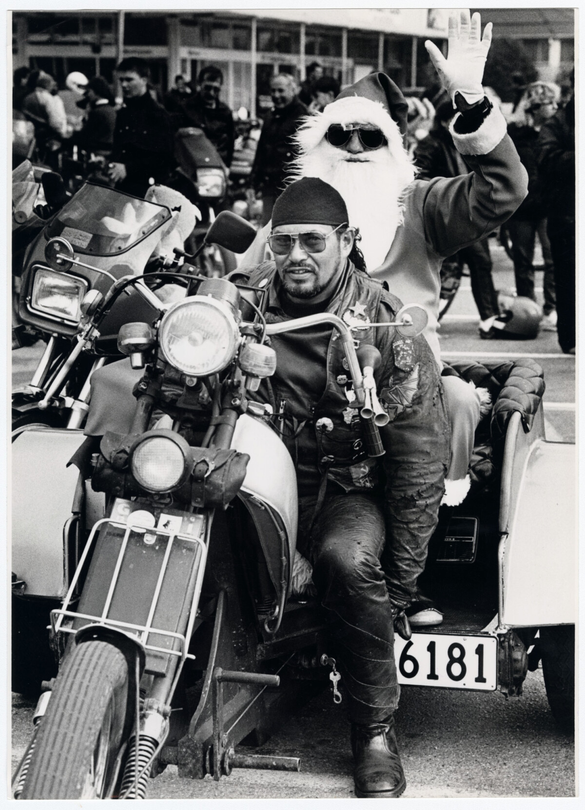 Santa Claus riding in Steve King's Volkswagen trike during a Christmas toy run around North Canterbury. Toys were handed over to the Salvation Army and Muscular Dystrophy Society at Hornby Mall.