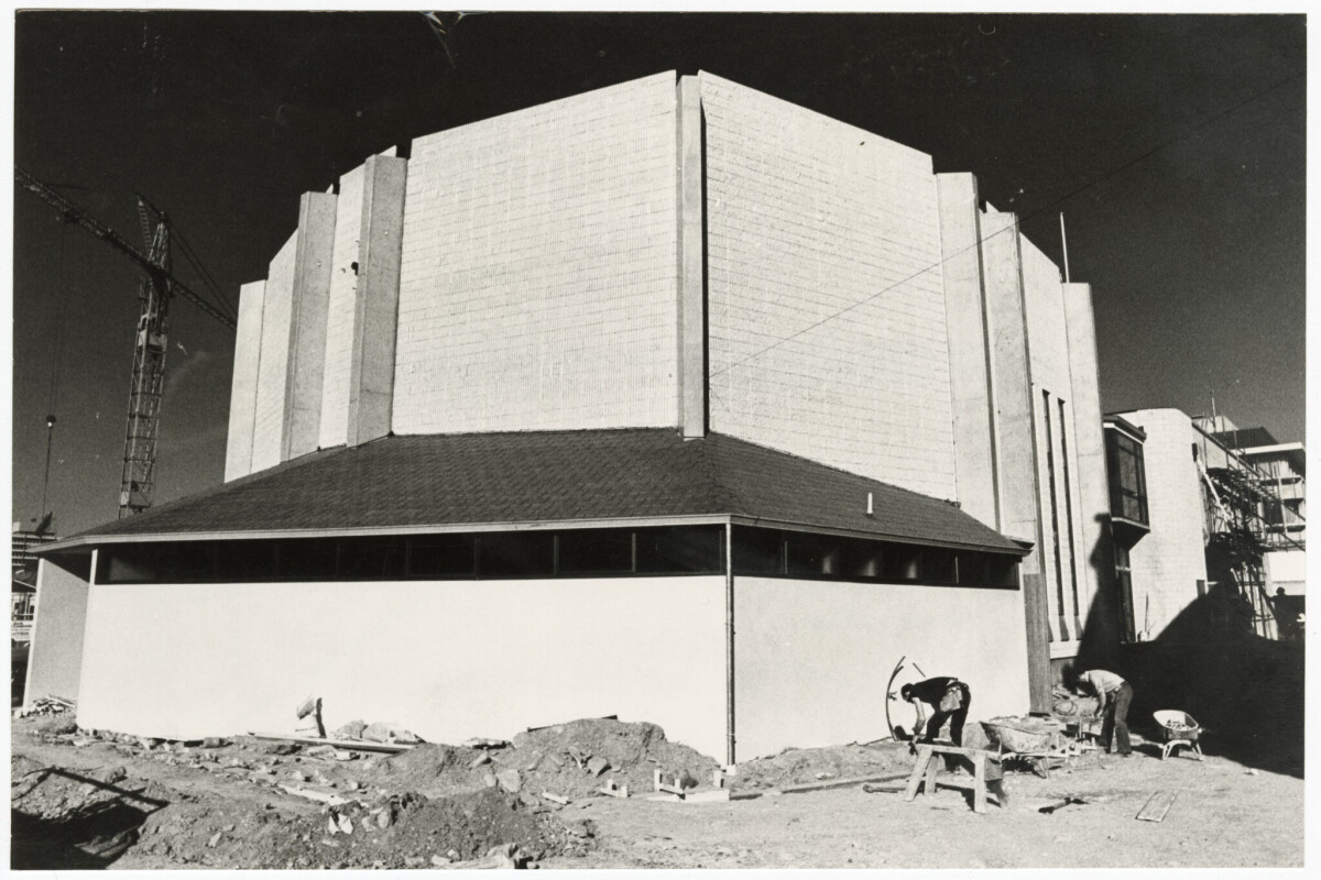 Workmen adding the finishing touches on the new Salvation Army citadel on Victoria Street near Victoria Square.