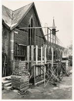 Exterior of the Church of the Good Shepherd at 4 Phillips Street, Phillipstown during construction works following a fire in the church hall. The church was built in 1885 by architect Benjamin Mountford, and contains a stained glass window of the church's first vicar, Reverend Hannibal Gilbert.