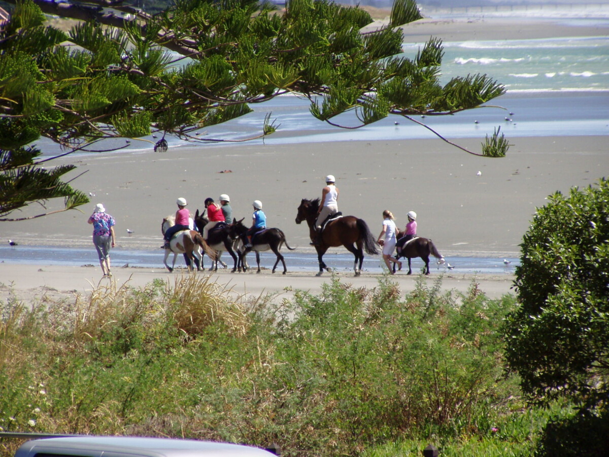 A group of children riding horses and donkeys along Sumner Beach. New Brighton Pier is visible in the background with a Norfolk Island Pine tree in the foreground.