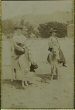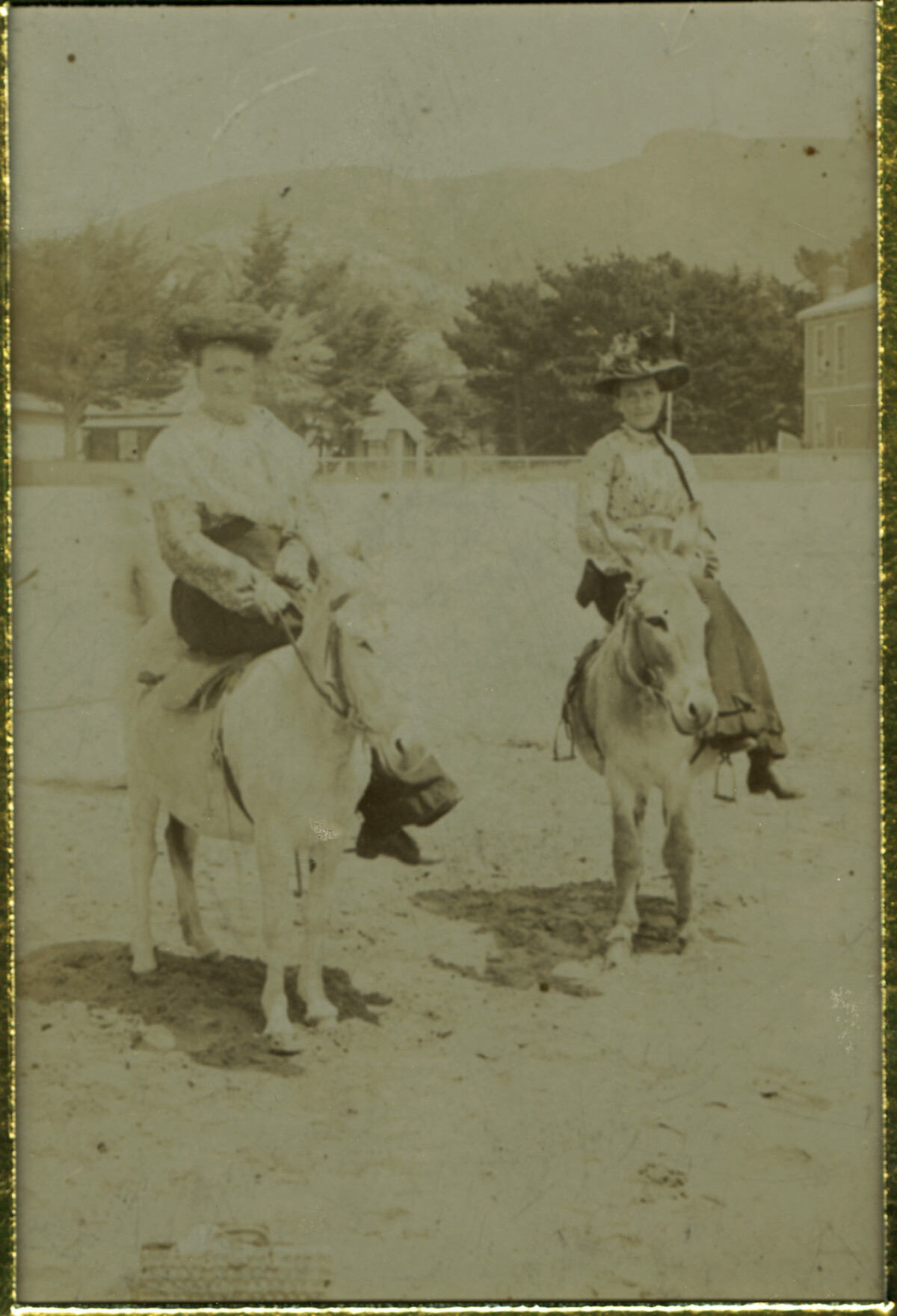 Grannie (on right) and Mrs. Henderson. Grannie is Marion Dickie nee Monaghan. Taken on beach at Sumner, Christchurch, circa 1906. Grandma Foley's grandmother - on holiday with friend Mrs Henderson in Christchurch.