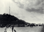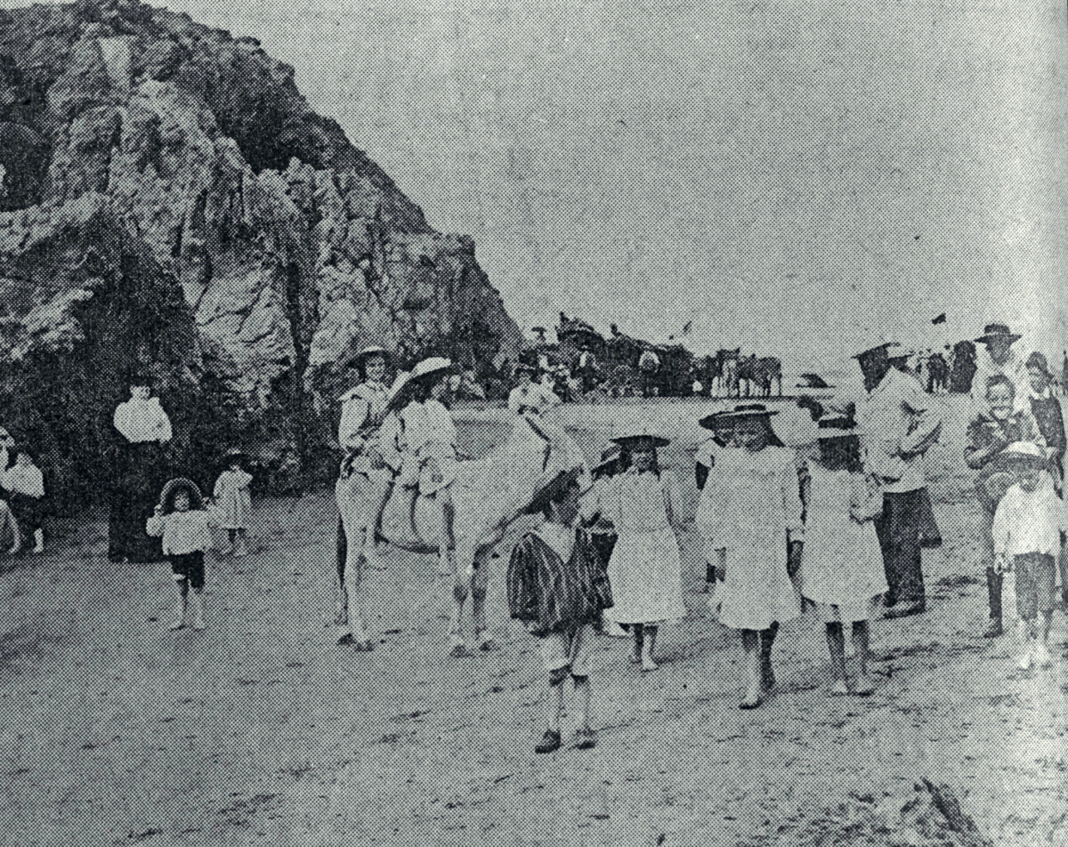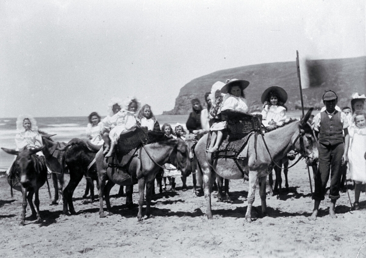 Children taking donkey rides on Sumner beach, looking towards Scarborough Hill.