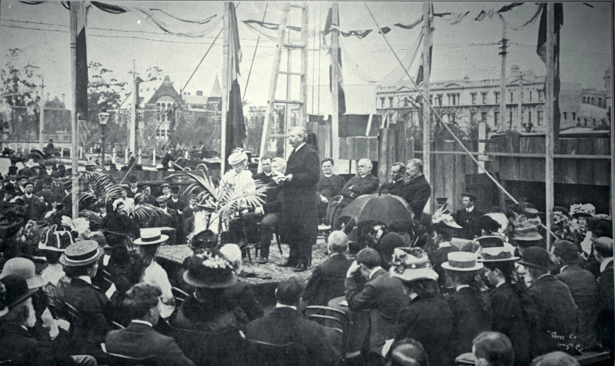 The foundation stone of the new building on the corner of Hereford Street and Cambridge Terrace, for the Young Men's Christian Association was laid by the Hon. George Fowlds, Minister of Education. Later Mildred Cracroft Wilson laid the foundation stone of the portion of the building (on the first floor) which would be for the Boys' Gordon Hall. Temporary staging for the ceremony was erected on the Hereford Street frontage where the foundation stones were laid. On the platform were the Hon. G. Fowlds, Mrs J. Cracroft Wilson, Bishop Julius , Mr C.E. Salter (President of the YMCA), Mr J. Dryden Hall, Rev. J. Mackenzie, Mr William Reece and Mr P. Hercus. Buildings shown in the background are, from left: the City Council offices, corner of Oxford Terrace and Worcester street opened in 1887, the Gas Company and the Clarendon Hotel.
