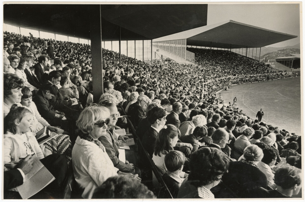 View across packed stands at Lancaster Park Stadium with delegates during the opening address of the Jehovah's Witness convention.