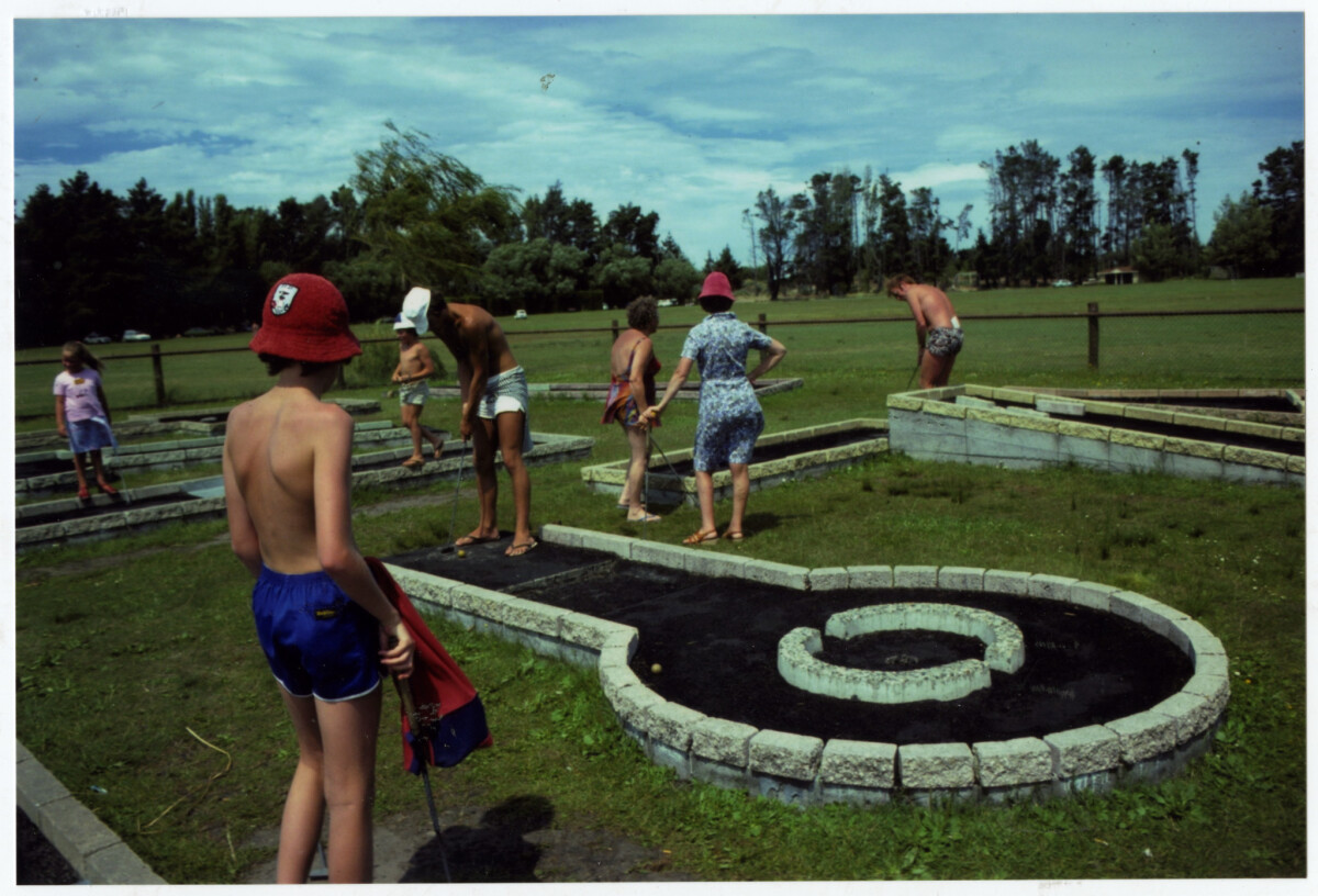 Contributor's note: "Spencer Park Domain family mini-golf competition. Old style mini-golf course. Short shorts, towelling hats, men and boys with no shirts."