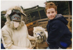 Andrew McNaughton, 6, from Avonhead, with an alpaca and a person in a sheep costume.