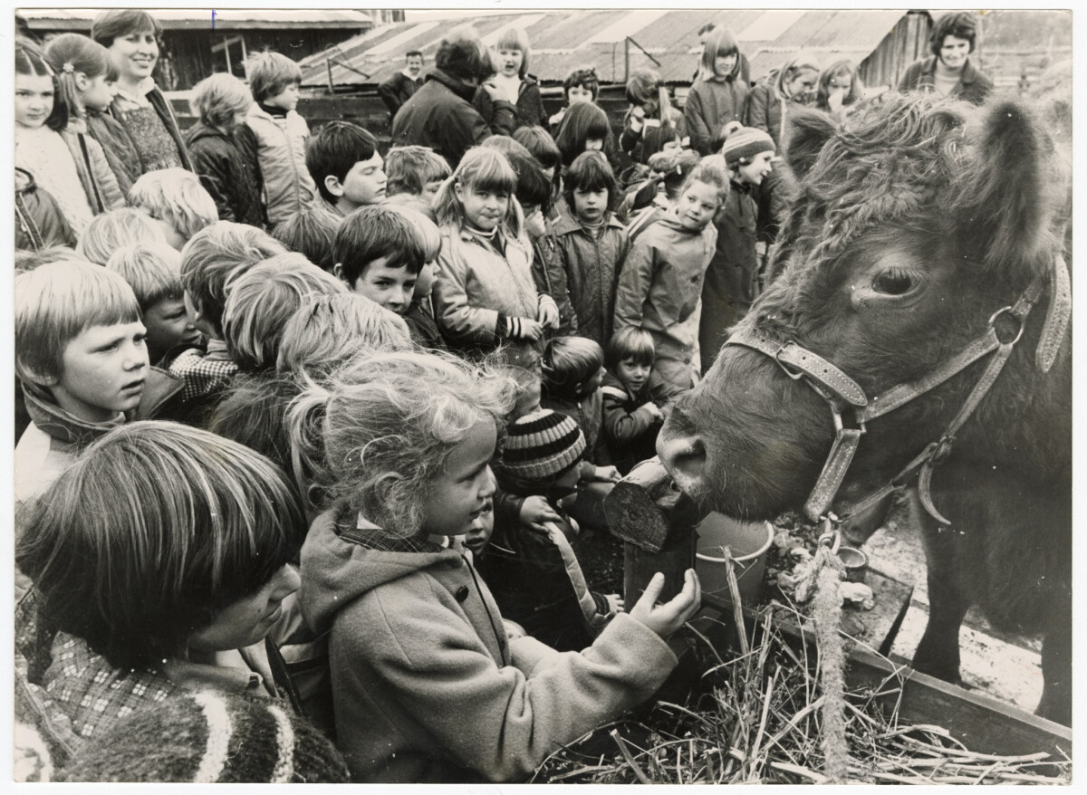 Audience of children from Cotswold School at Willowbank Wildlife Reserve, Northwood waiting for Michael Willis to milk Girl, a Highland cow, by hand.