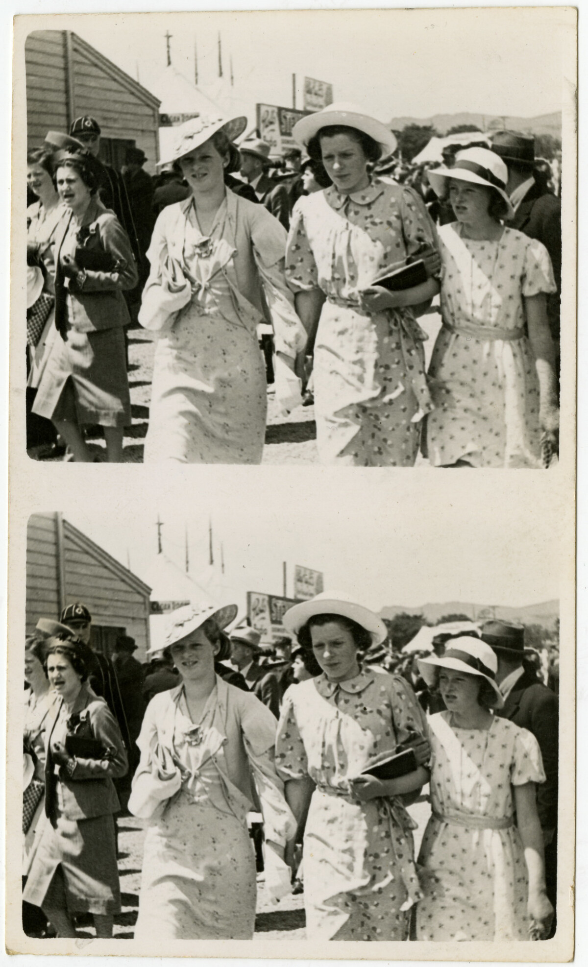 Two frames showing sisters Doris, Alice and Betty White on Show Day in 1938.