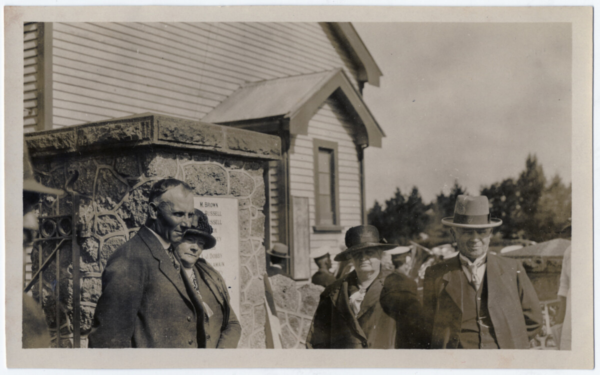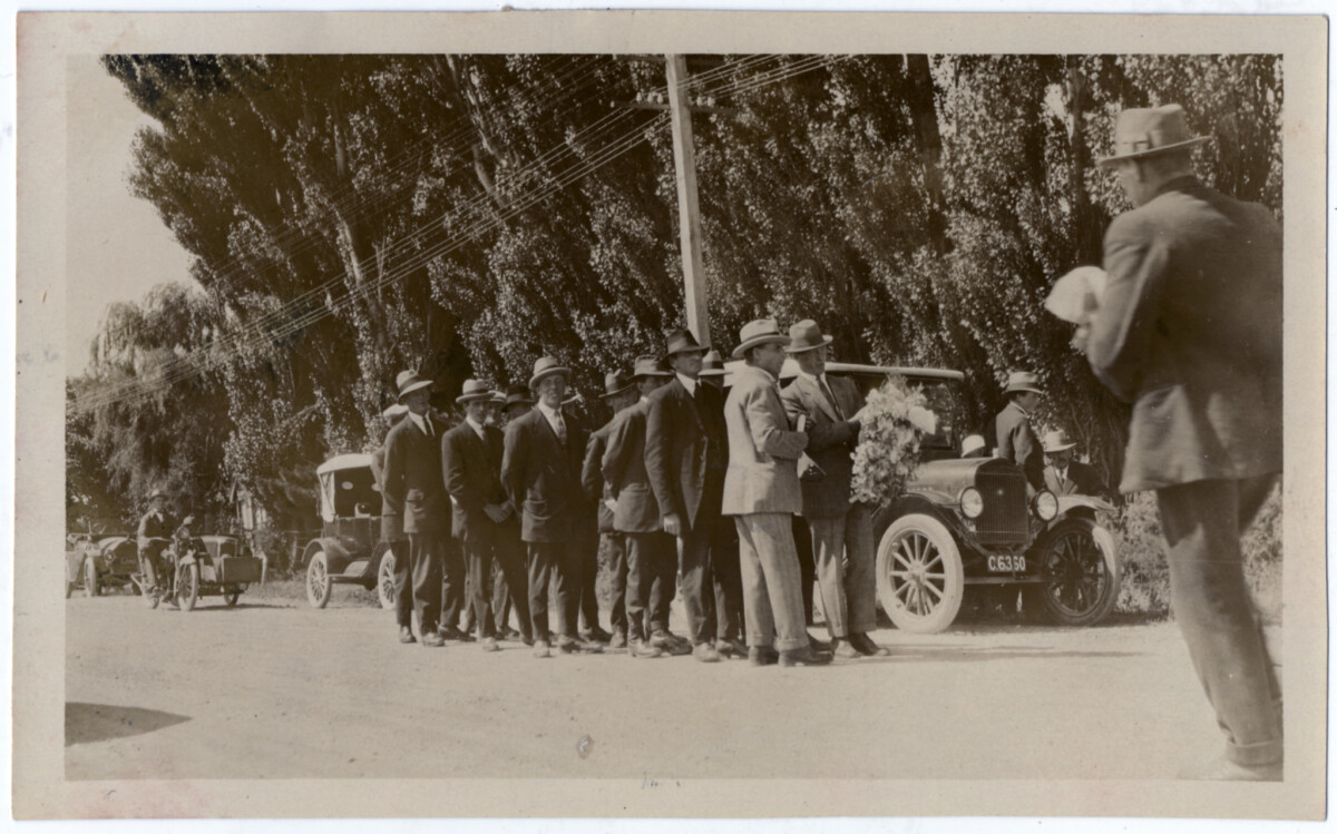 Dedication of the Marshland War Memorial Gates and Councillors lining up for the ceremony. The gates were unveiled by Mrs G Cox and Mr M Faulls (both parents of fallen soldiers and stalwarts of the Marshland Patriotic committee) W. H. Winsor was a mayor of Spreydon and City Councillor.
