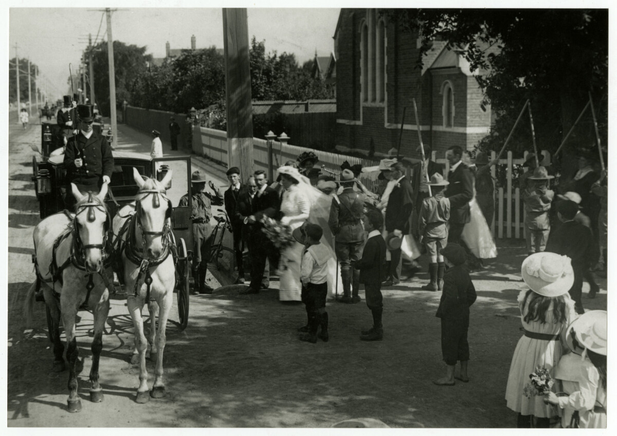 The wedding party approaches the horse-drawn carriage after their wedding in St Mary's Church, Papanui Road. Miss Rubina (Ruby) Gebbie of "Burnt Hollow" Teddington (on Gebbies Pass Road) married William Walter Cyril Cossgrove on 12 January 1910. They were my grandparents, at St Mary's Anglican Church, Merivale. The scout's guard of honour refers to the groom's father Lt-Colonel David Cossgrove who worked tirelessly to establish scouting in New Zealand from its inception in the U. K. in 1908. Note: The building in the background appears to be the the Sunday School building of the Methodist Church on the corner of Papanui Road and Rugby Street, one block north of St Mary's. However the and place of the Cossgrove-Gebbie wedding are undisputed & verified in official records so perhaps the wedding party walked along Papanui Road to the carriage.