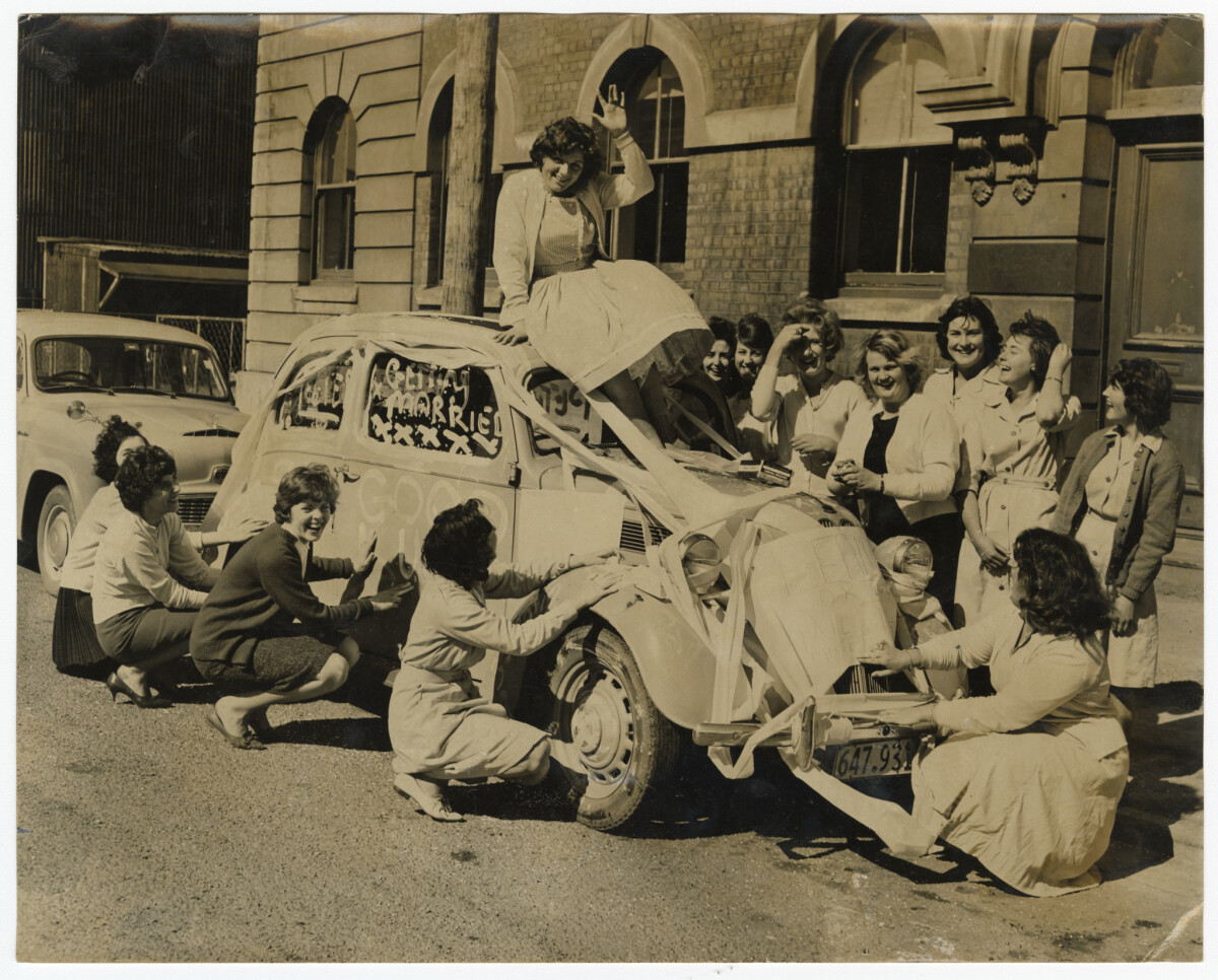 Gail Wallcroft sat on top of her car which has been decorated by her work colleagues at Moorhouse Avenue Post Office to celebrate her upcoming wedding.