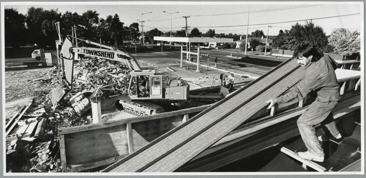 Joe Vuletich of Townsend Excavating removing roofing iron from demolished shops to make way for a new Mobil service station on the corner of Prestons Road and Main North Road.