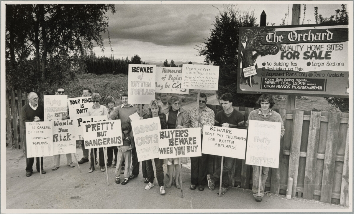 Residents of Clipper Place, Redwood, protesting the decision by Merritt Real Estate to keep the poplar trees on the boundary of their properties on Prestons Road. The residents claim the trees are rotten and are at risk of blowing down and are therefore dangerous.
