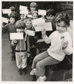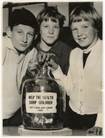 Three children, from left, Lewis Hampton, Rosemary Hajek and Judith Worthington at the Christchurch Star Office with a jar pre-decimal money to raise money for Glenelg Health Camp.