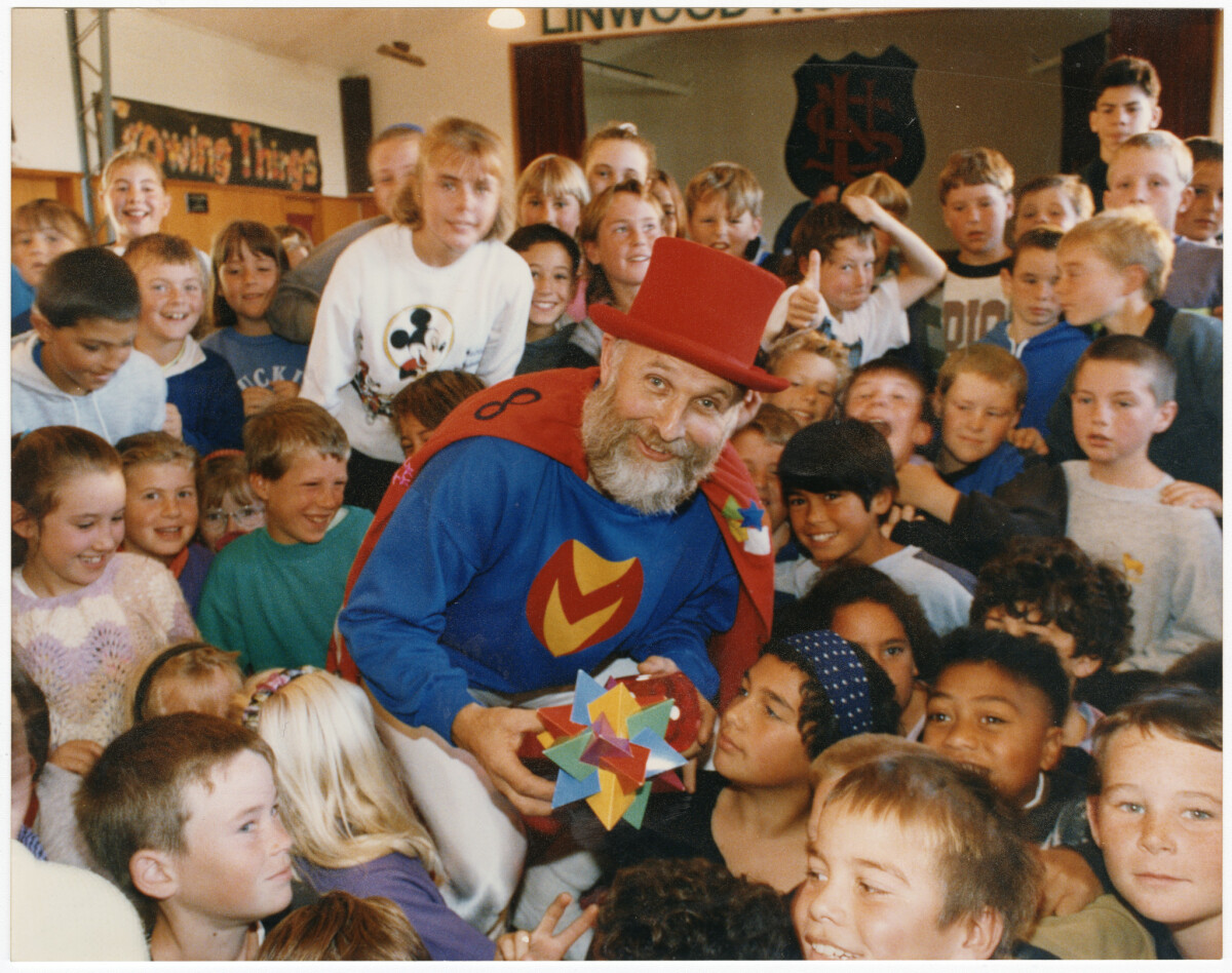 A magician in costume surrounded by a classroom of students from Linwood North Primary School.