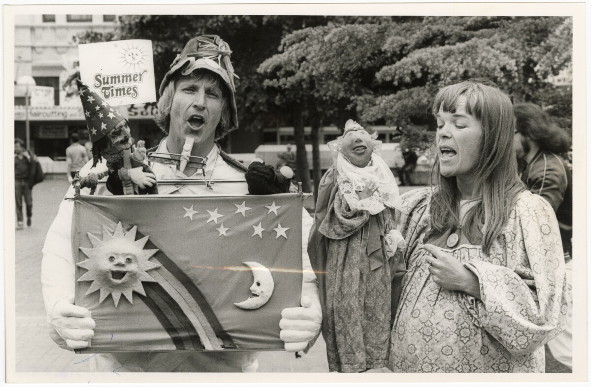 Kerry and Mary McCammon of Natural Magic Group performing with puppets in Cathedral Square for Summer Times festival.