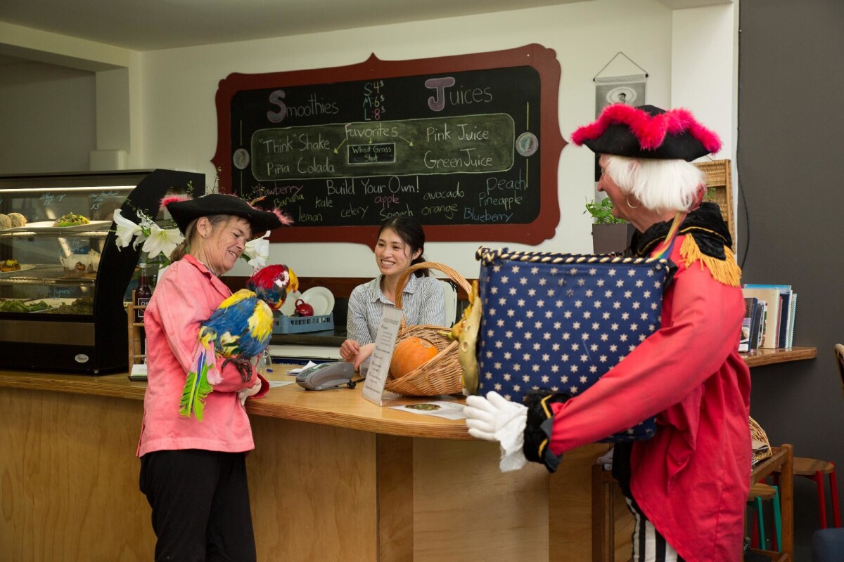 Natural Magic Pirates, Kerry McCammon and Mary McCammon interacting with staff behind the till as part of a pirate puppets children's show at Antidote Coffee and Juice Bar at Shop 6, Carnaby Mall in New Brighton.