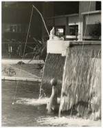Garden gnome fishing and a seal playing in fountains outside the James Hight Library at the University of Canterbury, added by students during capping week activities.