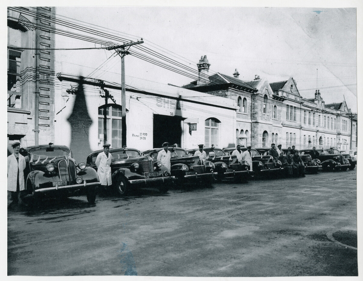 Men recently back from the war formed their own 'Kiwi' taxi firm. This photo shows all the owners and mechanics involved with the firm. White coats and dressed cars were used for weddings. Kiwi Kabs were located at 71 Hereford Street between the Police Station and the YMCA, later moving to Manchester Street.