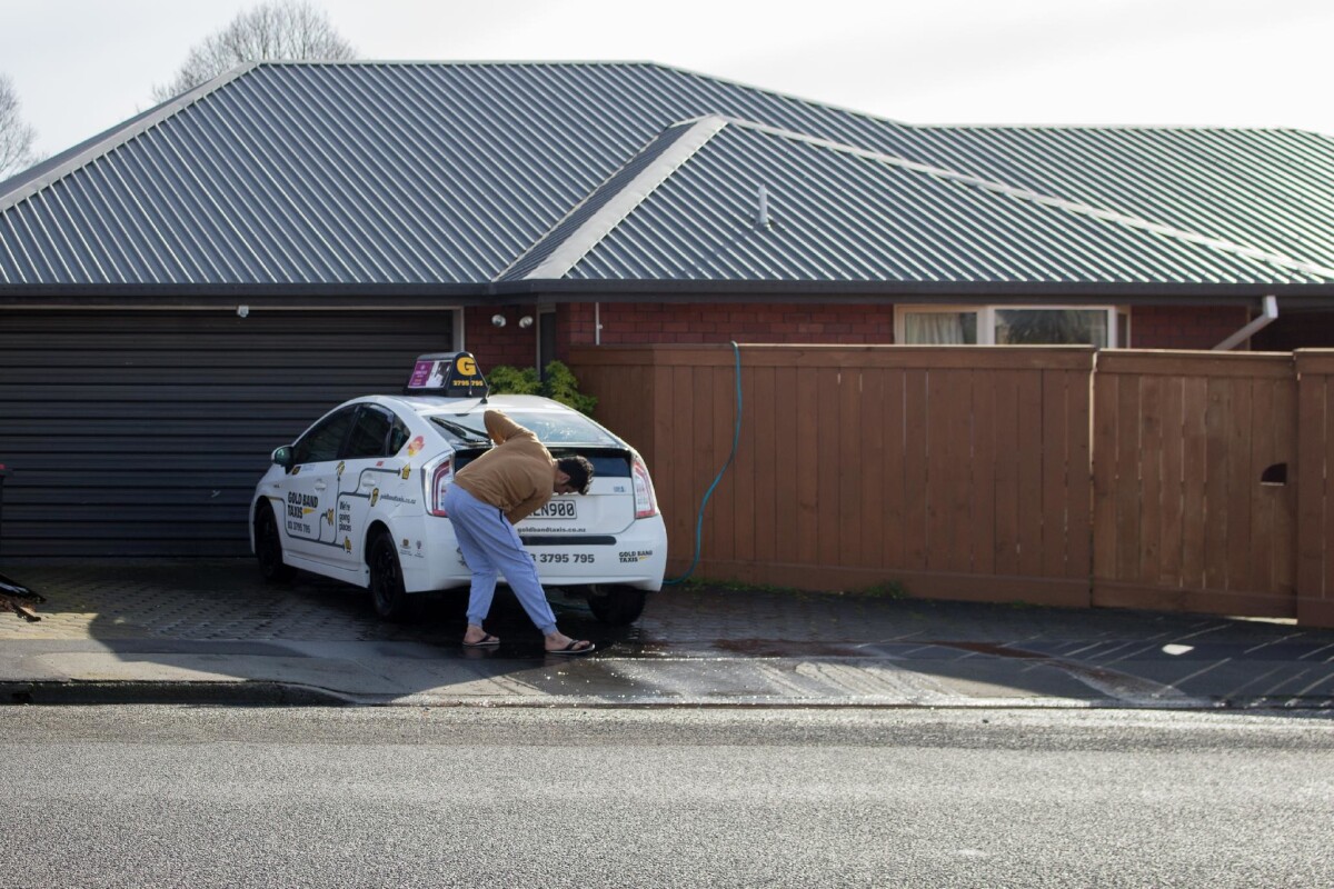 A taxi driver washing his car outside a house at 3 Farrington Avenue, Bishopdale.