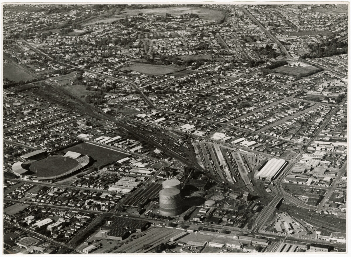 Christchurch gasworks & Lyttelton rail line from Waltham Road overbridge.