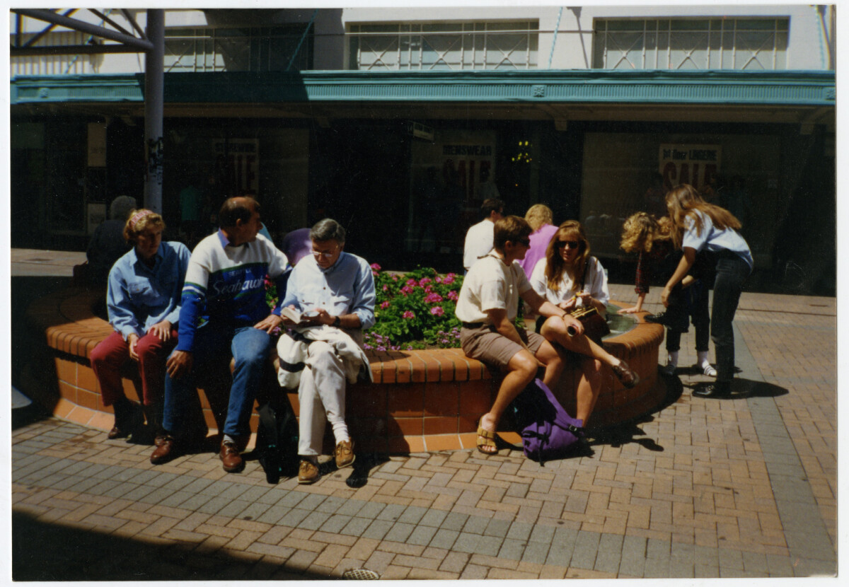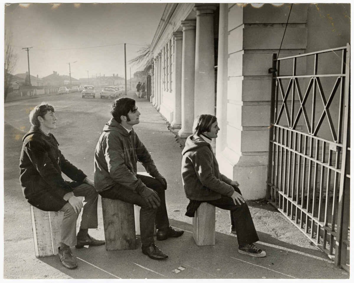 Kevin Cole, Darryl Edwards and Lance Mitchell sitting outside Lancaster Park queuing to get the best tickets for the rugby match between Canterbury and the British Lions.