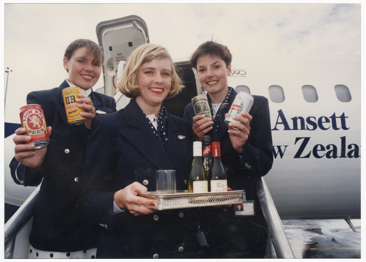 Ansett New Zealand staff stood outside an aeroplane with alcoholic drinks to mark the first introduction of bar services on domestic flights. Staff are, from left, Carole Becker, senior flight attendant with attendants Nicky Johns and Jenny Kilty.