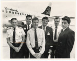 An all-male crew stood in front of an Ansett New Zealand aeroplane. The crew, from left, Captain Peter Stone with Adrian Dickins, Clay Bowden, Charlie Holmes, First Officer Alan Davenport and Reuben Tomars.