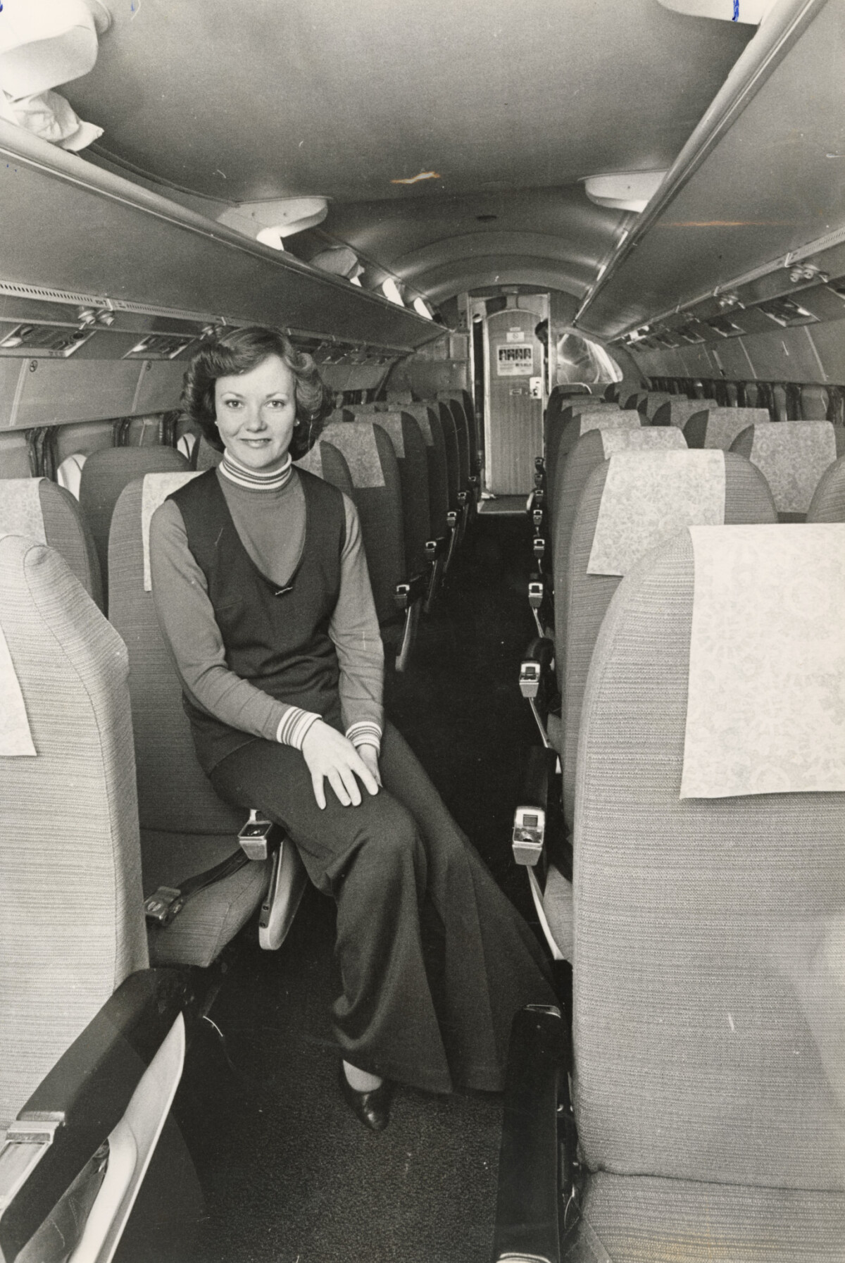 Robyn Arnott, air hostess, sat inside the cabin of an old-style National Airways Corporation (NAC) Fokker Friendship aeroplane (ZK-BXI) ahead of a redesign of the cabin interior.
