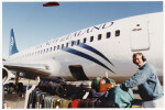 Exterior of a branded Air New Zealand Boeing 737 aeroplane on the tarmac at Christchurch Airport with Barry McCullough, general aircraft hand, in the foreground handing a baggage trolley.