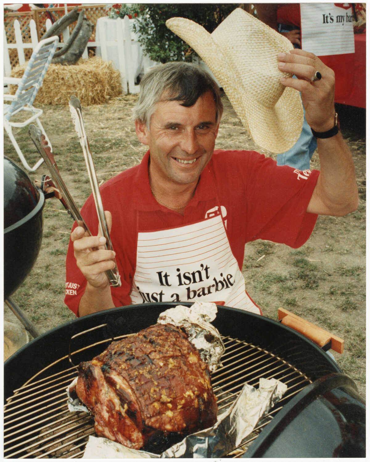 David Tait, a competitor at the New Zealand barbecue championships in Christchurch, checking his roast pork on the barbecue.