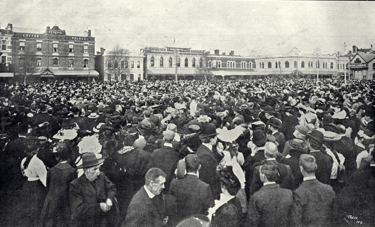 A crowd of mourners listen to the combined Christchurch municipal bands play the Dead march at Hon R J Seddon's memorial service, Victoria Square.
