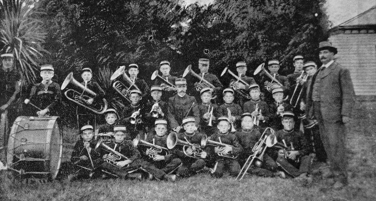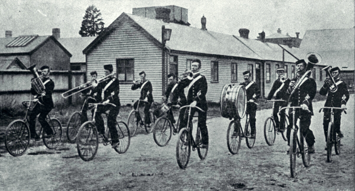 The Christchurch cycling brass band is pictured on their Star cycles. The band claimed to be the only one of its type in the world. They held instruments in one hand and steered their cycles with the other. Pictured from left are H. Woods (euphonium), A. Gordon (cornet), H. Flanagan (trombone), F. Taylor (cornet), W. Crawford (side drum), T. Dalton (trombone), F. T. Hopkins (drum), F. W. Painter, Bandmaster (cornet), Arthur James Watts (1863-1956) (bass), G. Lake (horn).