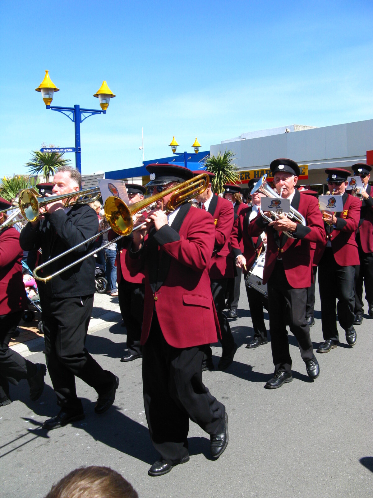 Members of the New Zealand Community Trust Woolston Brass band performing outdoors.