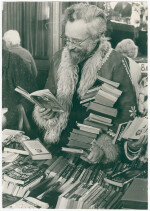 A man with a pile of books at the North Canterbury Red Cross annual market to raise funds for meals-on-wheels and disaster relief teams.