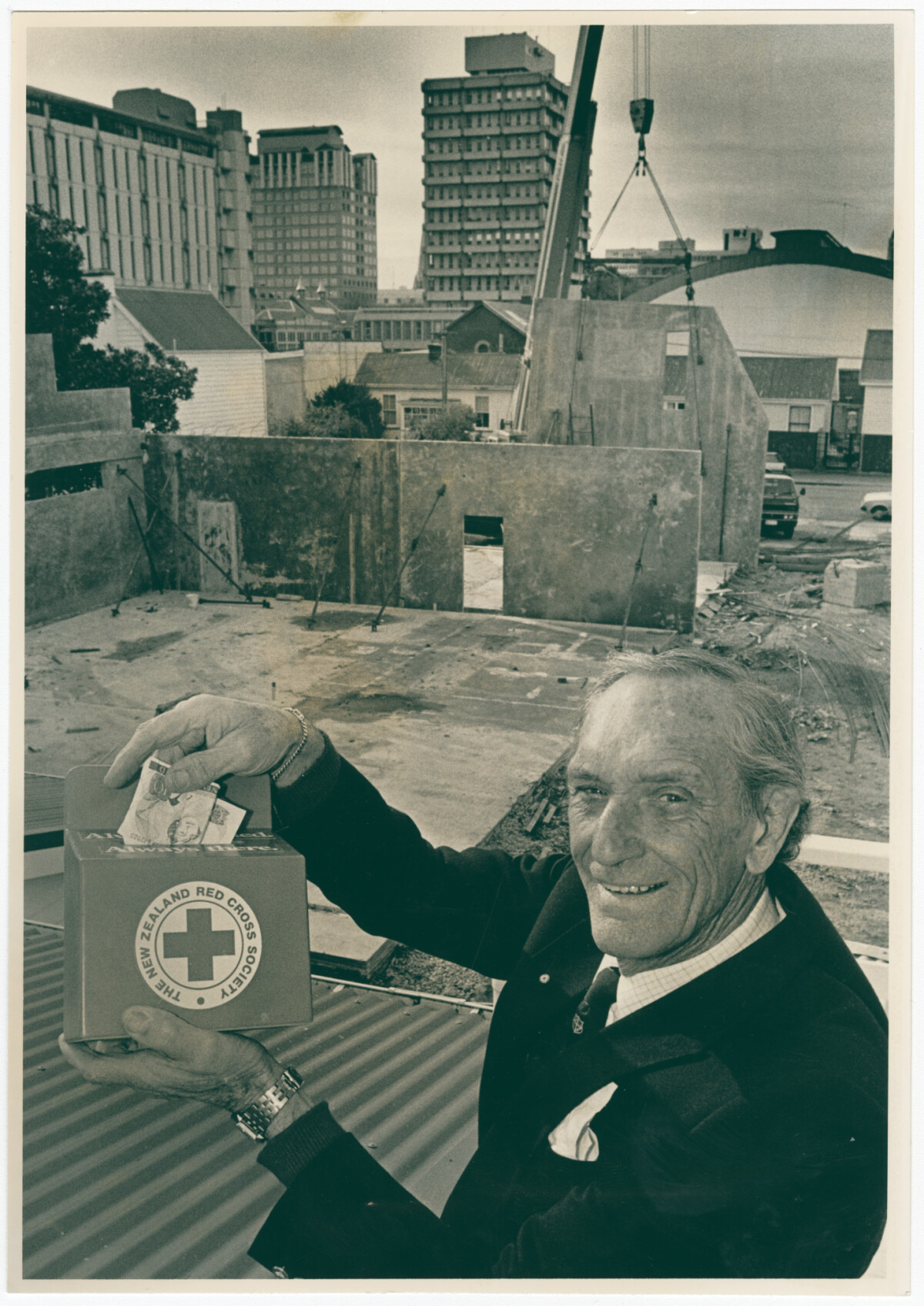 Cran Hearn, a former Second World War prisoner of war who received Red Cross parcels during his imprisonment, stood on the construction site of the new Red Cross Society emergency relief building on Cashel Street. Hearn is holding a Red Cross donation box and has been fundraising for the charity to raise money for the new building.