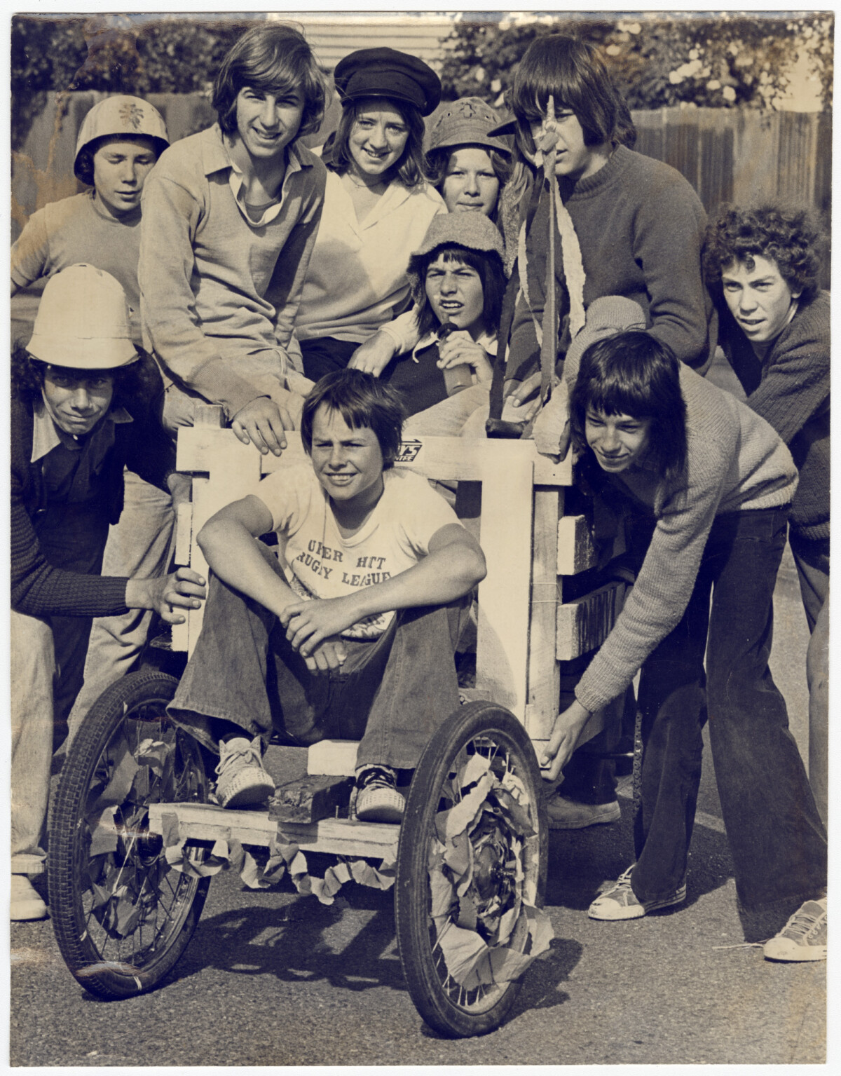 Hillmorton High School students pushing a wheeled contraption to raise money for paraplegics. Over 2 days the students will cover about 80 miles around a five mile and a half radius of the school and will be covered in four relays.