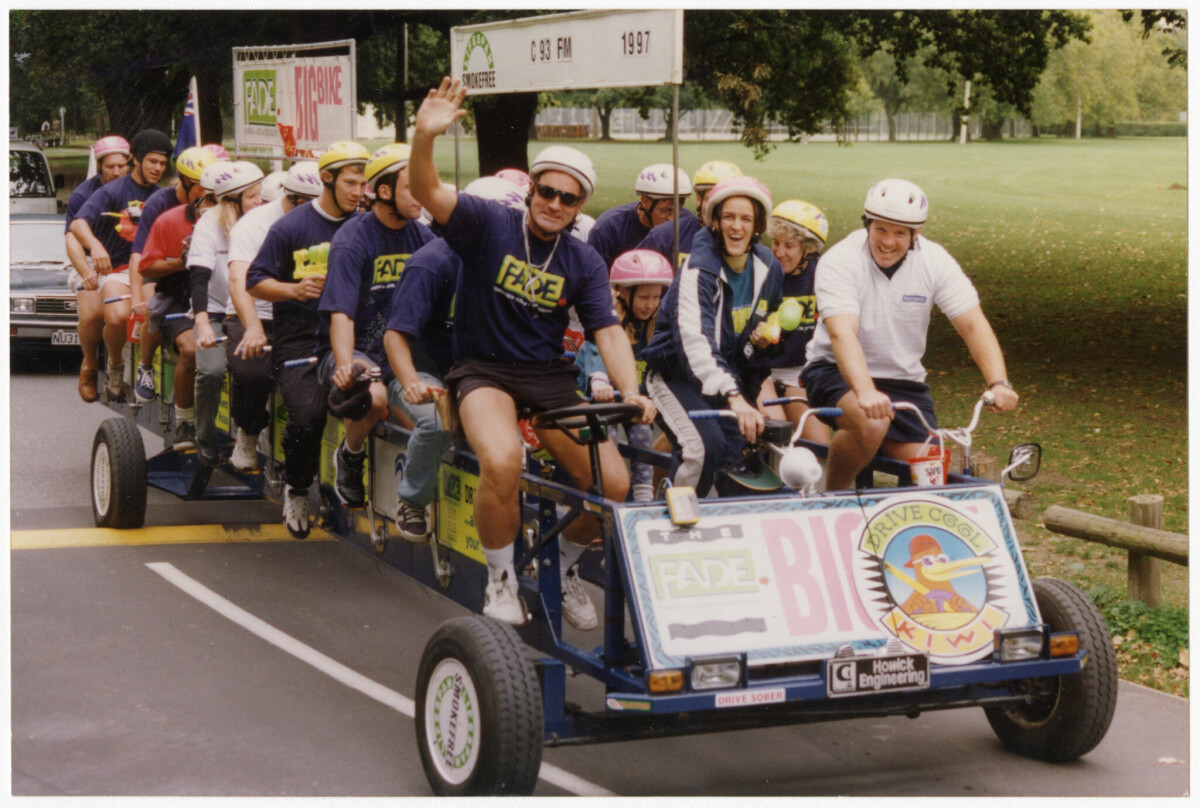 Team riding a 30-seater Big Bike for the Foundation for Alcohol and Drug Education fundraiser in Hagley Park. Leading the team at the front of the bike are, from left, Graham Minckley, Margaret Foster and Matt Sexton.