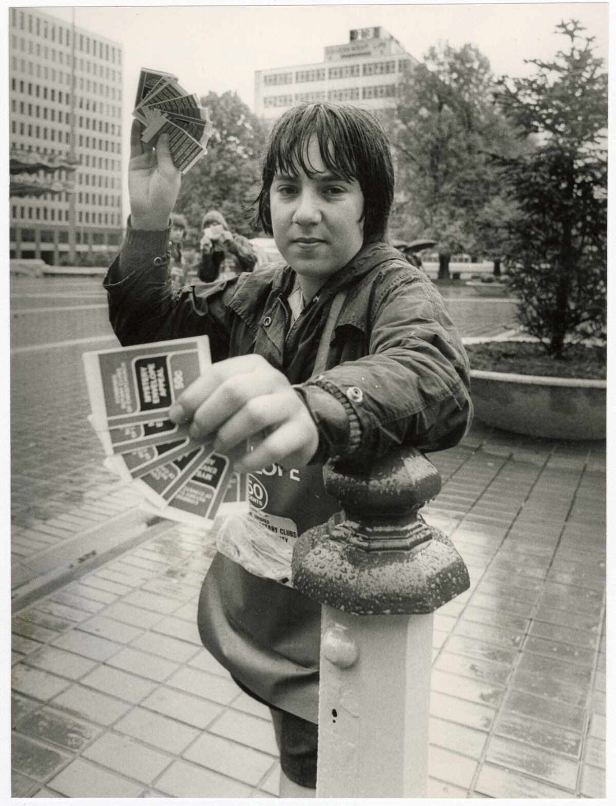 Stephen Jones selling the Combined Christchurch Rotary Clubs' Christmas appeal mystery envelopes in Cathedral Square.