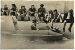 Engineering students from Aranui High School with a hovercraft they built, in the school swimming pool. Test driving the craft is student Russ McKinley with other students watching from the poolside.