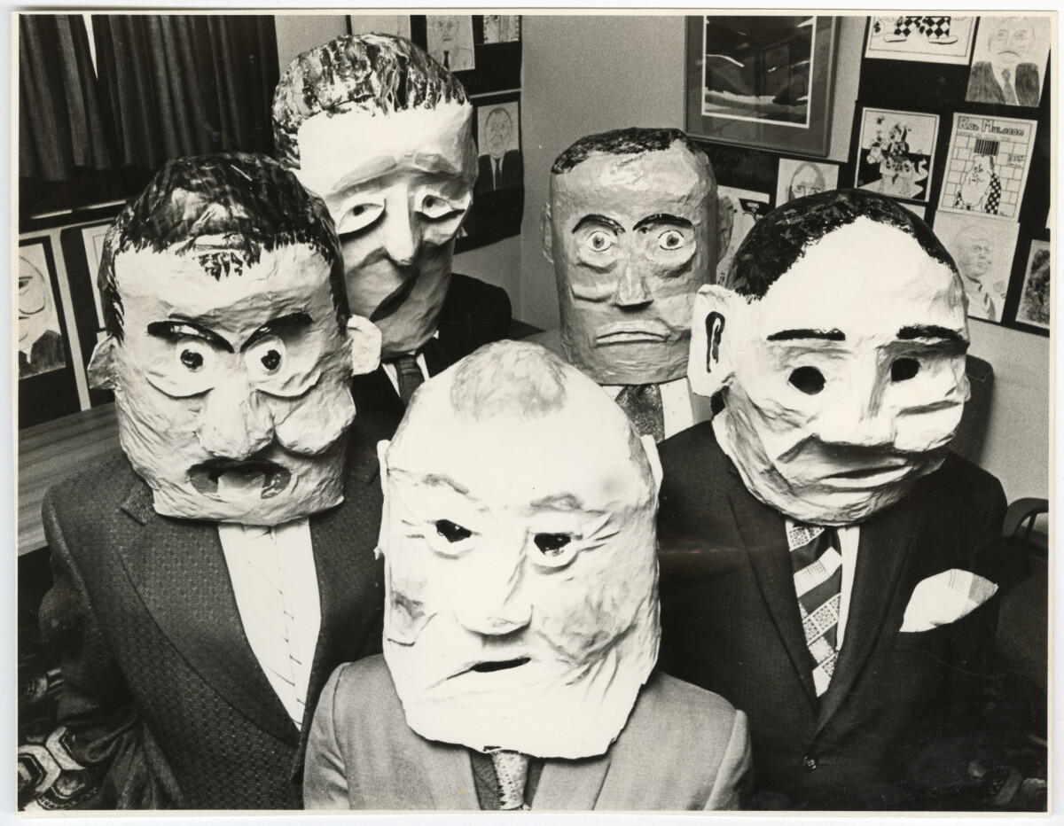 Pupils from a third form art class at Hornby High School wearing papier-mache masks of Robert Muldoon, Prime Minister of New Zealand. From left, Diane McIIwrick, Angela Sweeney, Jason Radonovich, Aaron Hughes and Grant Downing.