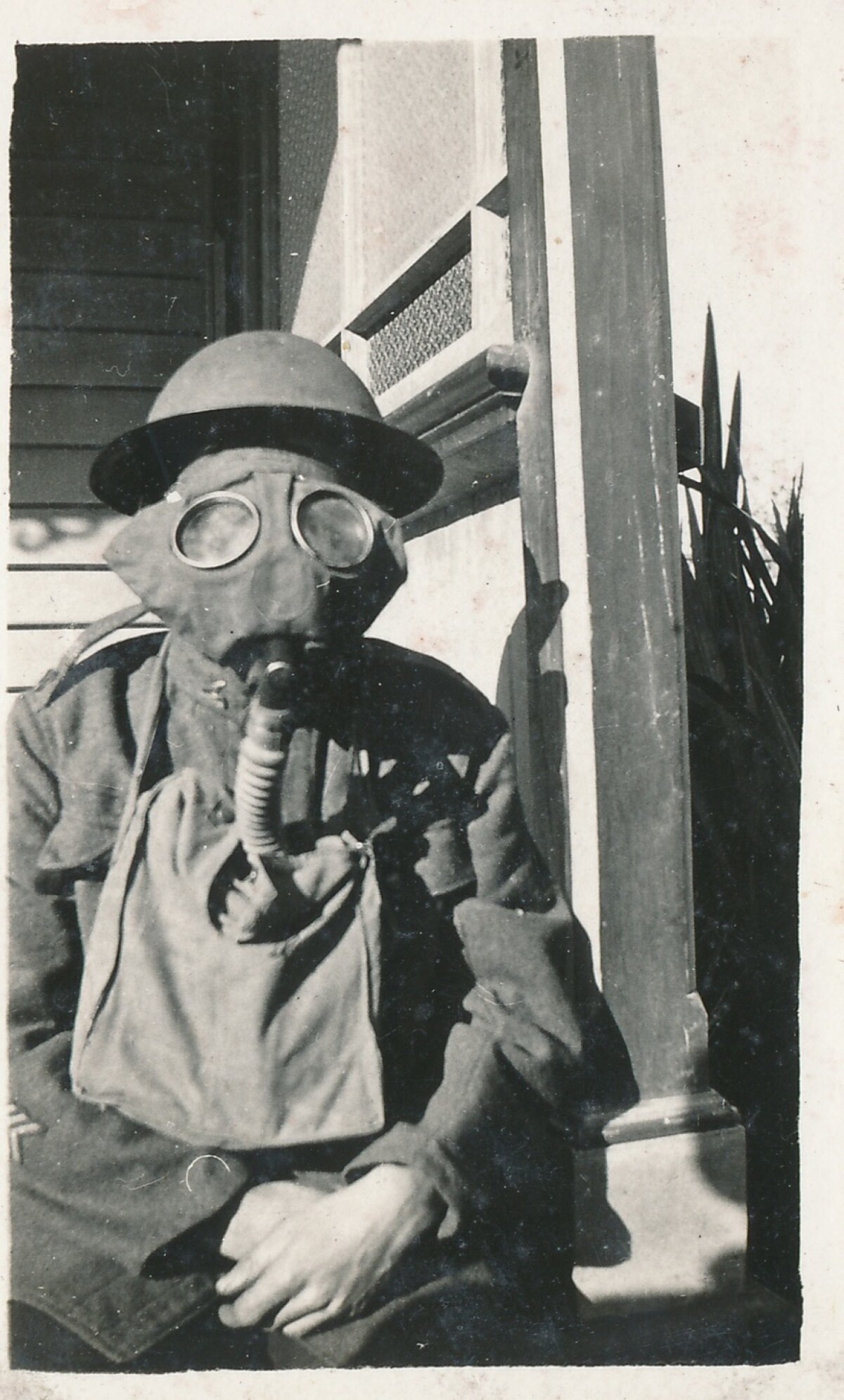 An unidentified member of the Pearce family wearing a WWI gas mask and army uniform at the Pearce family home in Aikmans Road, Merivale.
