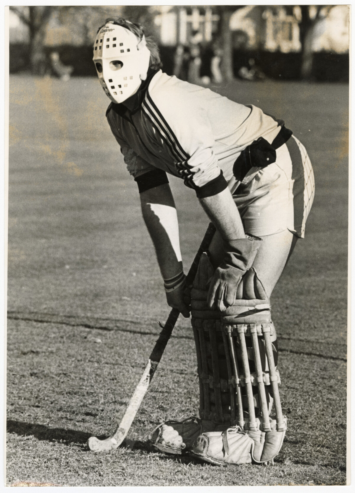 Goal keeper for Selwyn hockey team, Peter Bodeker, during a match wearing a mask covering his face to protect him against fiercely struck shots for goal.