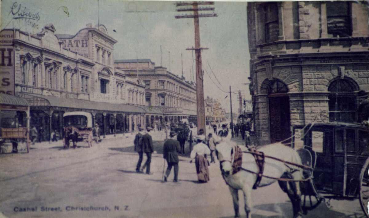 Cashel Street, Christchurch, N.Z.. Colourised postcard from circa 1900