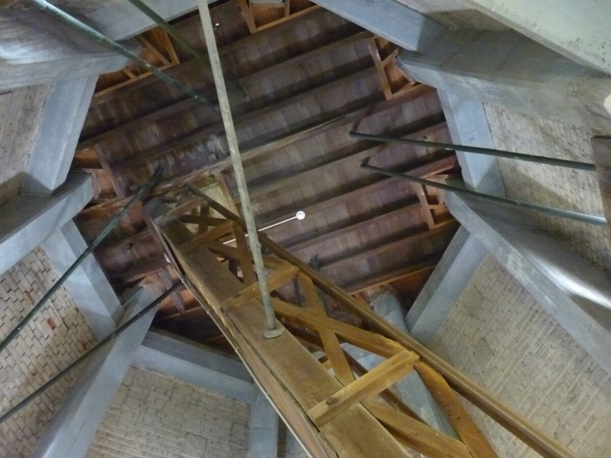 Looking up the final wooden staircase inside the spire of Christchurch Cathedral